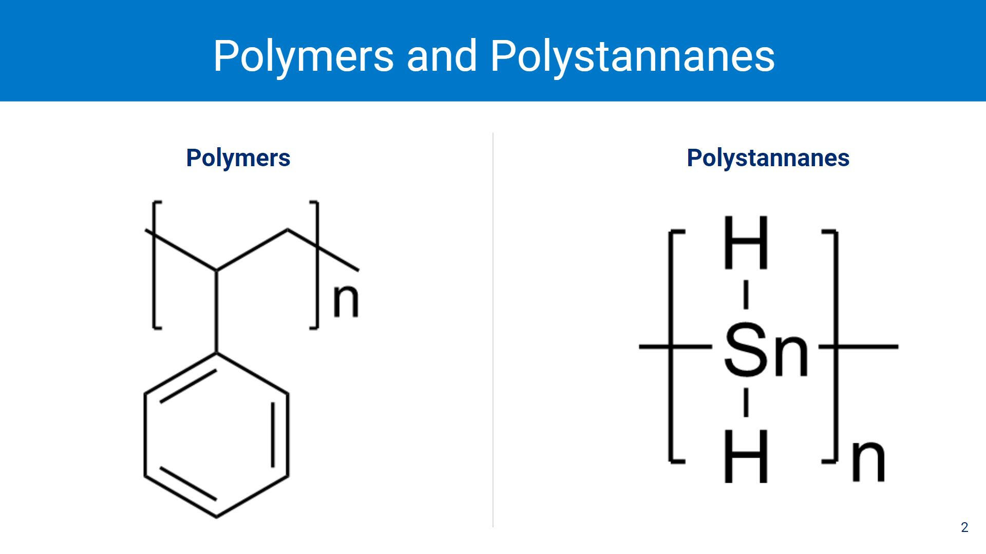 Polymers are a large macromolecule with repeating subunits called monomers. The most common use for polymers is in the development and manufacturing of plastics (polystyrene, pictured on the left, is used to make Styrofoam).Polystannanes (pictured on the right) are essentially polymers but with a repeating tin (Sn) backbone. Polystannanes have the potential to be semiconductors for electronic applications.