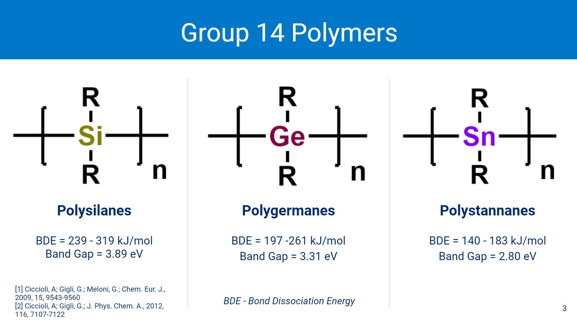 When compared to other Group 14 polymers, polystannanes are shown to have a smaller band gap (2.80 eV) compared to polysilanes (3.89 eV) and polygermanes (3.31 eV). A smaller band gap allows for better conductivity, but polystannanes also have the largest bond dissociation energy out of the 3 classes of polymers. A larger bond dissociation energy leads to weaker bonds between the Sn-Sn centers.