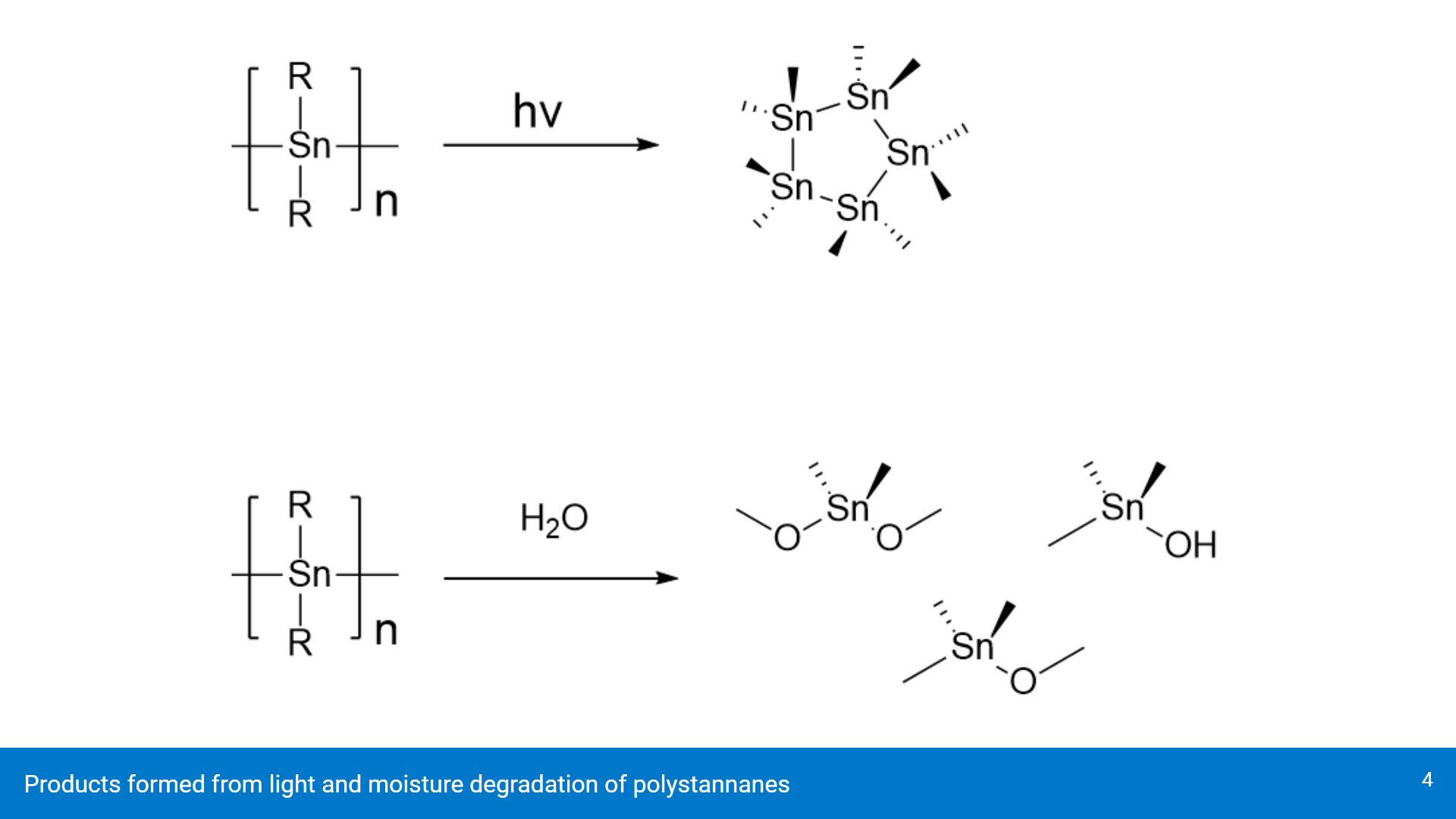 The larger bond dissociation energy is problematic, as the Sn-Sn bonds break with exposure to light (top reaction) and moisture (bottom reaction). Exposure to light causes polystannanes to break down into cyclic stannanes while moisture creates stanoxanes. Both products are not conductive, which is not useful for creating semiconductors for electronics.