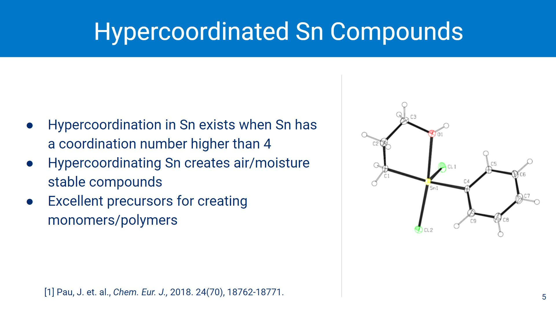 One way to reduce the reactivity of the Sn-Sn bond is by introducing sterics around the Sn centers. 5-coordinate Sn creates air and moisture stable compounds, which is useful for creating polystannane monomers (and eventually polymers).