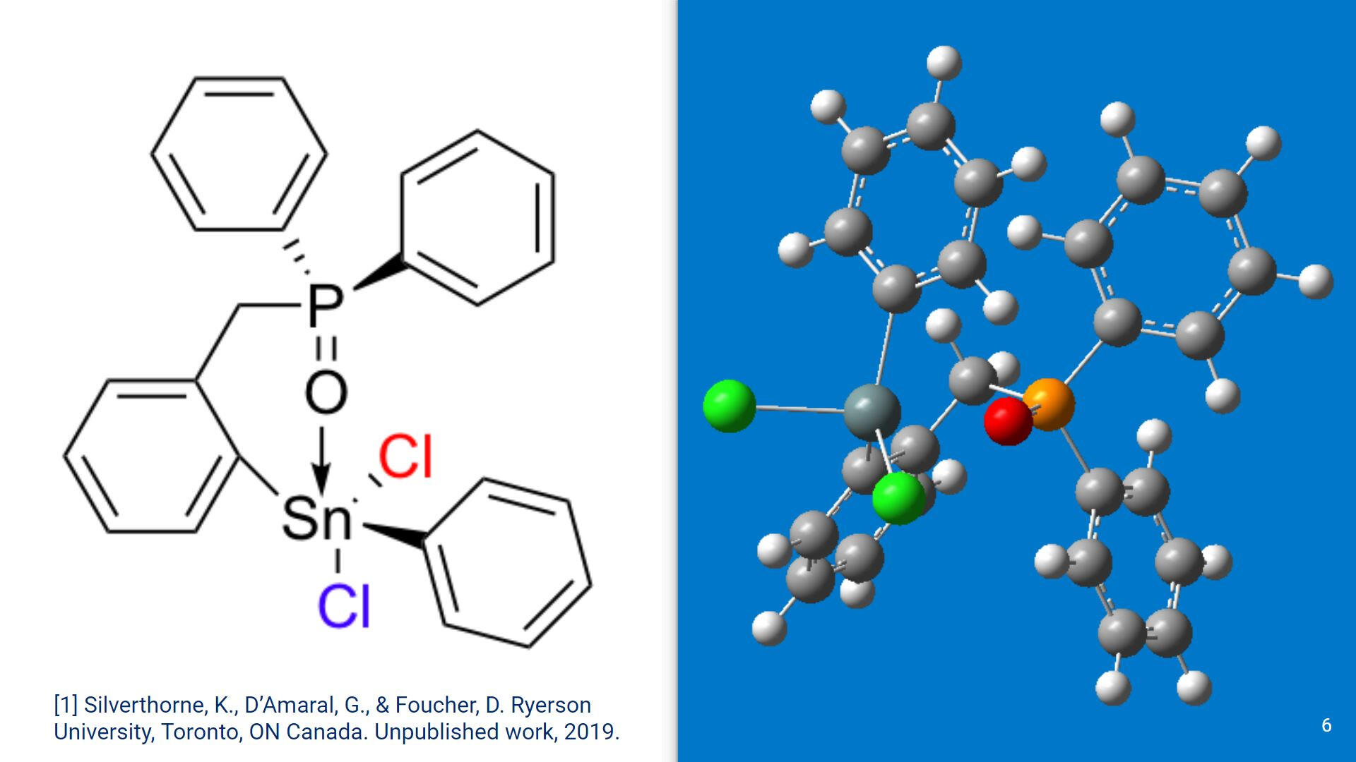 On the left is a graphical representation of a recently synthesized hypercoordinate Sn compound. On the right is a GaussView screenshot of the molecule. This organotin compound differs from previously synthesized organotin species, as it is one of the first systems with a phosphine oxide group coordinating with the Sn center.As of this moment, a solid state structure for this compound has not been found.