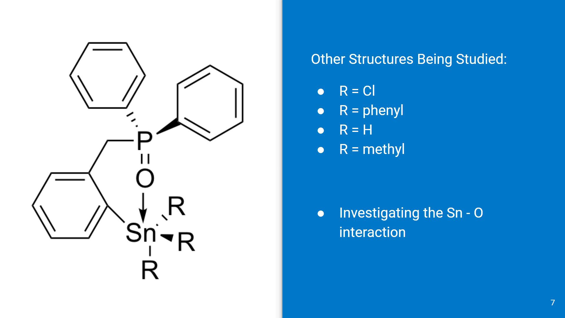 In this ab initio study, the R groups on the Sn center were modified to see how different ligands affect the overall Sn-O interaction.For simplicity, the ligands used were Cl (to model the experimental structure), H (for creating the monomer), phenyl and methyl groups (for geometry and energy comparisons).