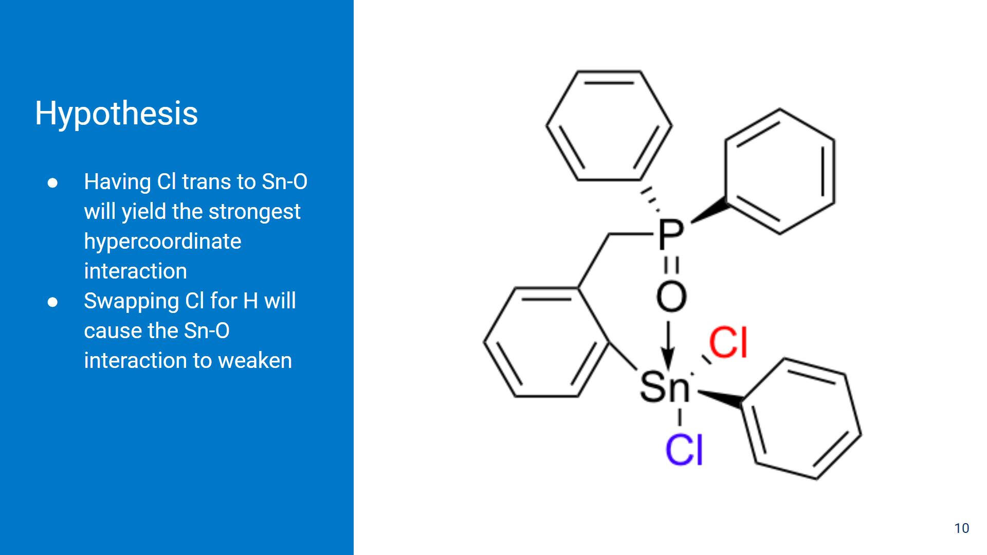 Our hypothesis is that having the Cl ligand trans to the Sn-O interaction will create the strongest interaction, but changing the ligand to something less electron-withdrawing will weaken the interaction.