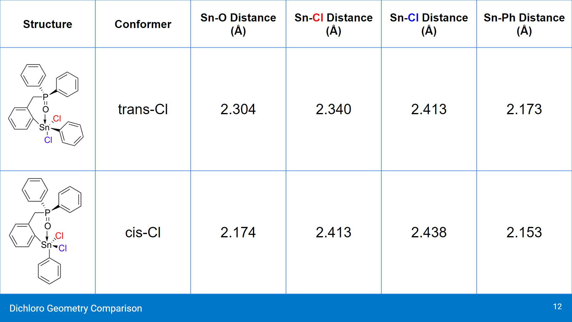 As suspected, the Cl ligand trans to the Sn-O interaction did elongate slightly. What's surprising about these results is that the cis conformer of the dichloro compound showed a smaller Sn-O distance than the trans conformer. In the cis conformer, the Sn-Ph distance also shortened, rather than elongate.
