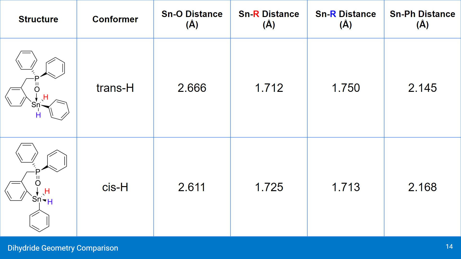 When substituting the Cl ligands for H, there was a significant elongation of the Sn-O interaction in both cases. The cis conformer had a slightly shorter Sn-O distance of 2.611 Å compared to the trans conformer. Something interesting to note is the Sn-Ph distance in the cis conformer is longer than in the trans conformer, which is different than when the compound had Cl ligands.