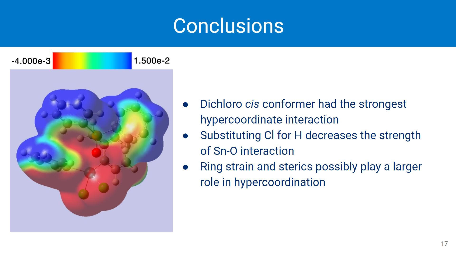 Despite initial assumptions, the cis conformer of the dichloro organotin showed the strongest Sn-O interaction. Ring strain and overall sterics potentially play a larger role in hypercoordination, though the extent of these roles is still being investigated. Changing the ligands on the Sn center does affect the Sn-O interaction by weakening the interaction.Picture: A very coarse electrostatic potential surface mapped onto the trans-dichloro conformer.