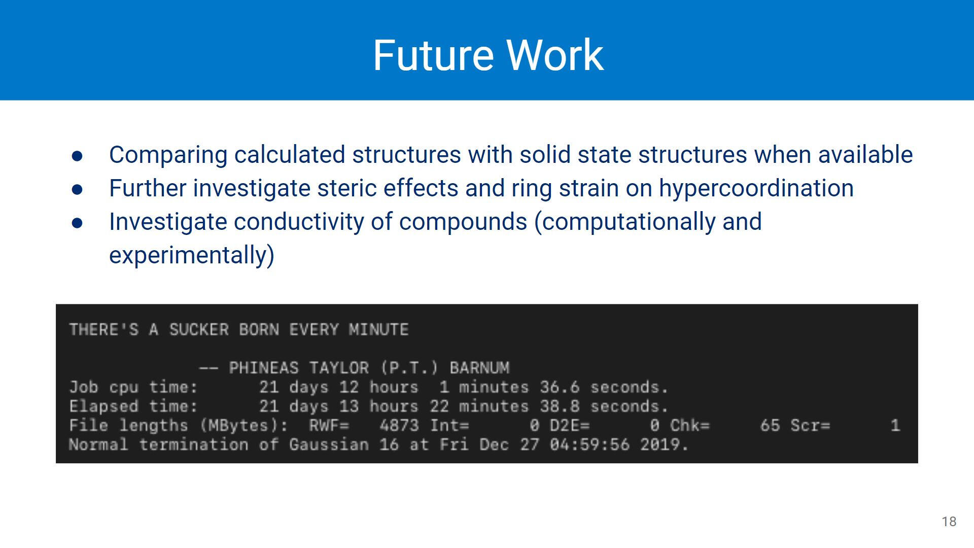 Future work is now focused on investigating the ring strain effect on hypercoordination and looking into the conductivity of these compounds. In terms of the experimental portion, a solid state structure of the compound needs to be identified for comparison to the calculated structures.Picture: One of my longest calculations (triphenyl conformer frequency calculation).