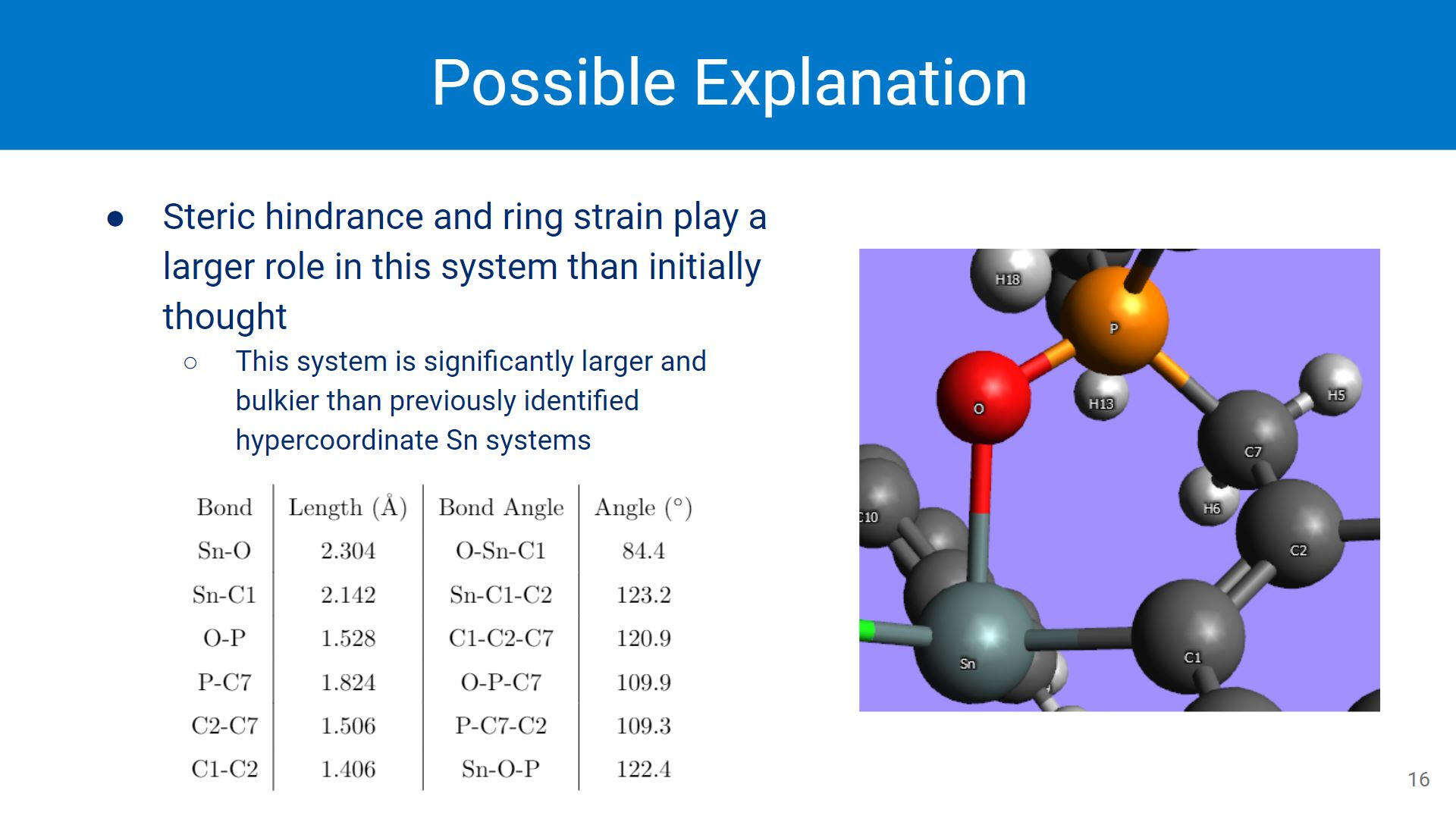Since this system is one of the first hypercoordinate Sn systems without a solid state structure available, assumptions were made about its behaviours. Previously identified systems would show the Cl ligand trans to the Sn-O or Sn-N interaction, but this is not the case with this system.This system is also significantly larger and bulkier than other previously identified systems. The amount of ring strain created in these systems (depicted) could also have an effect on the overall stability of the conformer.