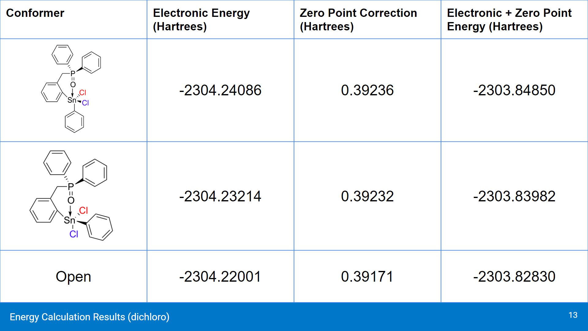 In terms of their energies, these compounds were predicted to be less stable with the ligand substitution. This is largely due to H being a less electronegative group compared to Cl. H likely does not draw the electron density from the O-P group in a similar way that the Cl ligand has been shown to do. Once again, both the chelating geometries were shown to be more electronically favourable compared to the open, non-chelating conformer. This trend is consistent with the systems that were studied.